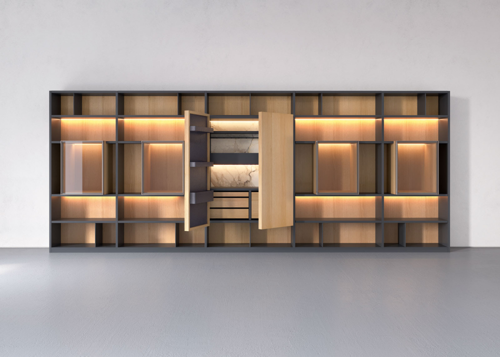 개인의 취향에 맞추어 제작되는 505 업 시스템은 기존의 책장 기능을 뛰어넘어, 범위를 확장합니다. 수평 및 수직 구조의 선반 그리드를 기반으로, 혁신적인 돌출 캐비닛과 디스플레이를 적용하여 구성과 스타일의 유연성을 높여줍니다. 2023년에 니콜라 갈리지아(Nicola Gallizia)는 도어와 동일한 높이의 핸들이 적용된 새로운 도어 디자인을 도입하여, 레이아웃을 보다 아름답게 만들었습니다. 505 업 시스템은 전통적인 책장 기능에서 벗어나 솔루션을 확장하고 현대적인 라이프 스타일을 위한 모던 가구로 자리매김하고 있습니다.