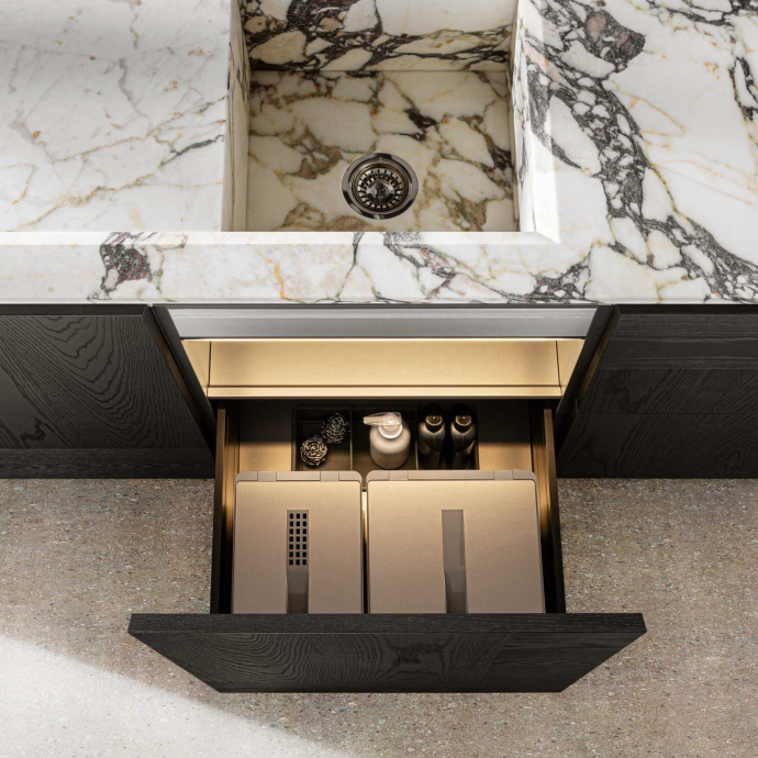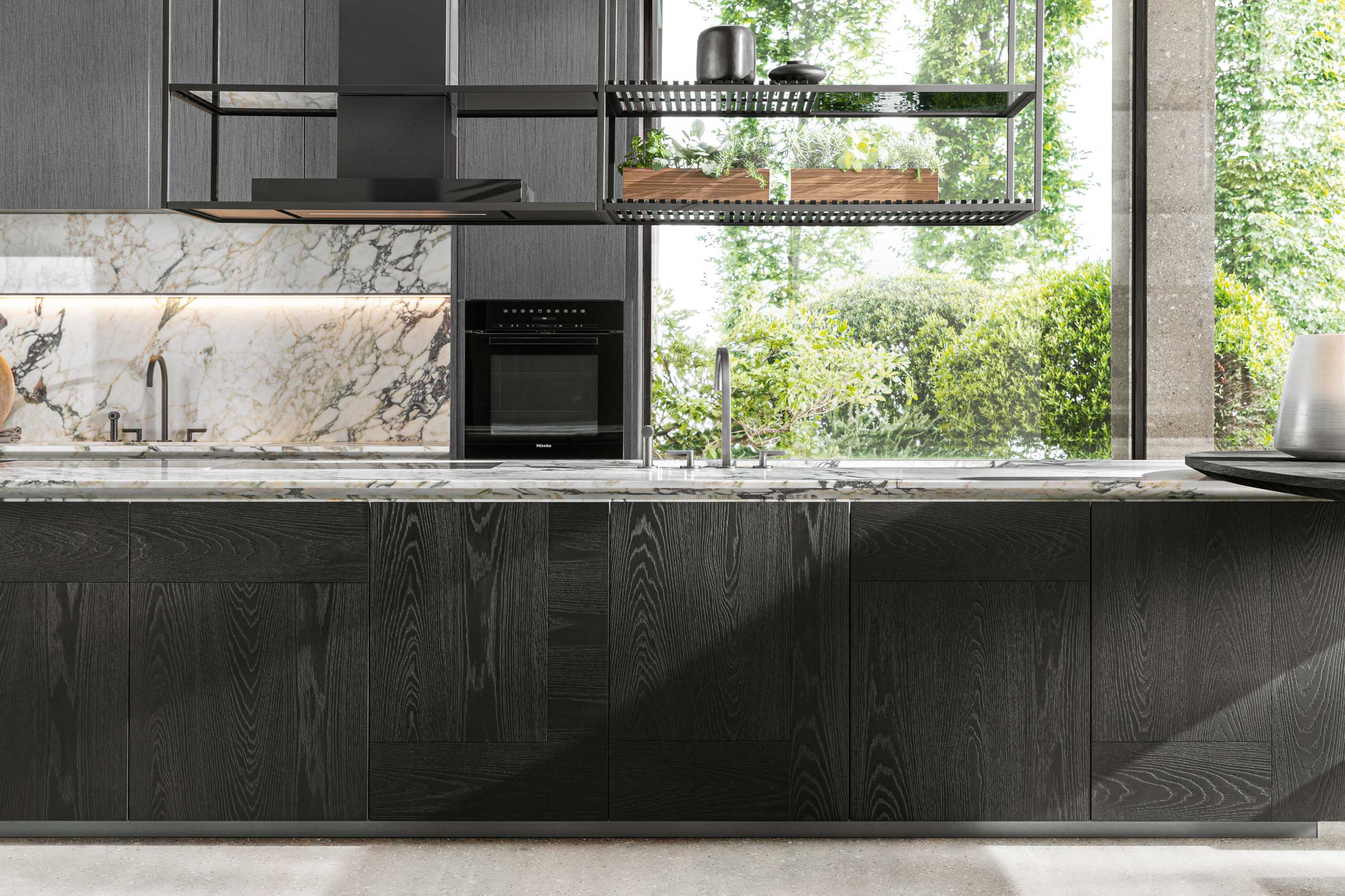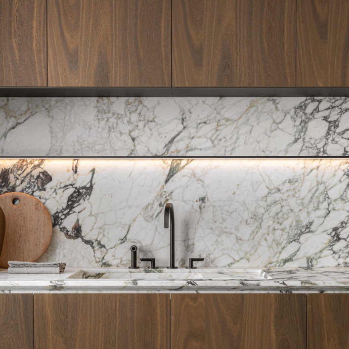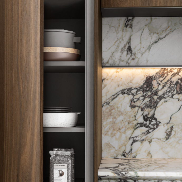 단일 재료로 구성된 주방 구조는 알루미늄 패널을 통해 한층 더 가볍고 안정적이면서도 견고해지며, 도어와 아일랜드 측면 패널이 올인원으로 제작될 수 있도록 합니다. 재료의 특성 상, 독특하고 반복적이지 않은 모습을 선보이는 천연 암석은 집안에 화사함을 선사합니다.