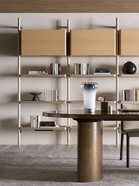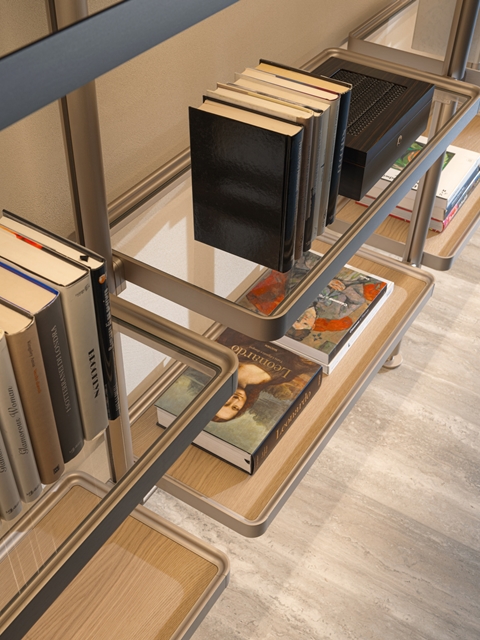 헥터 책장은 가볍고 깔끔하게 구성할 수 있도록 디자인되었으며, 모듈식 요소를 활용하여 원하는 크기와 높이로 구성할 수 있습니다. 또한, 마감재의 다양한 조합을 통해, 시각적인 이미지와 모양 측면에서 다양한 구성이 가능합니다. 목재나 알루미늄 소재로 제작된 모서리가 둥근 선반은 서로 수직으로 연결되어 있으며, 하단부는 유리나 목재로 제작됩니다.