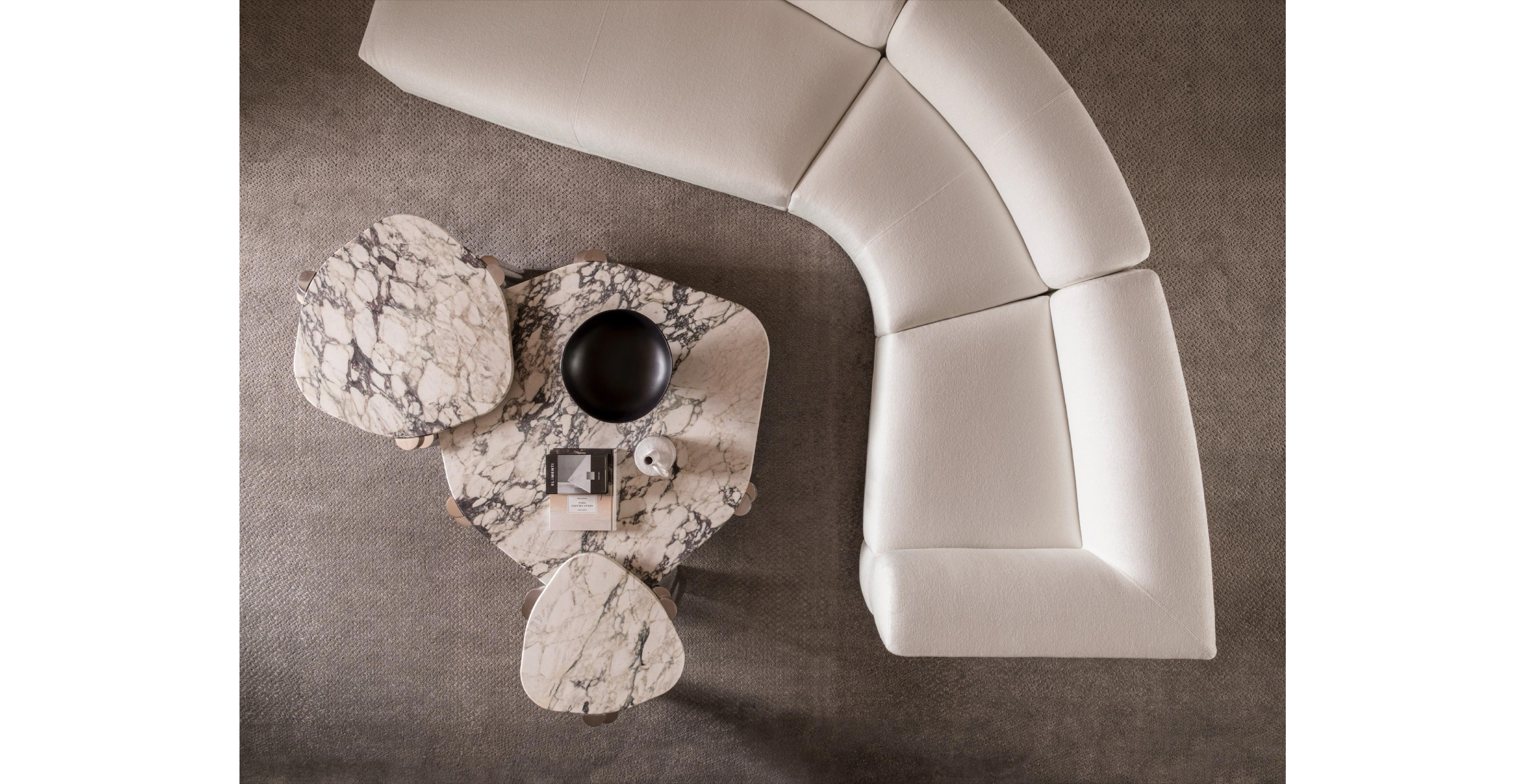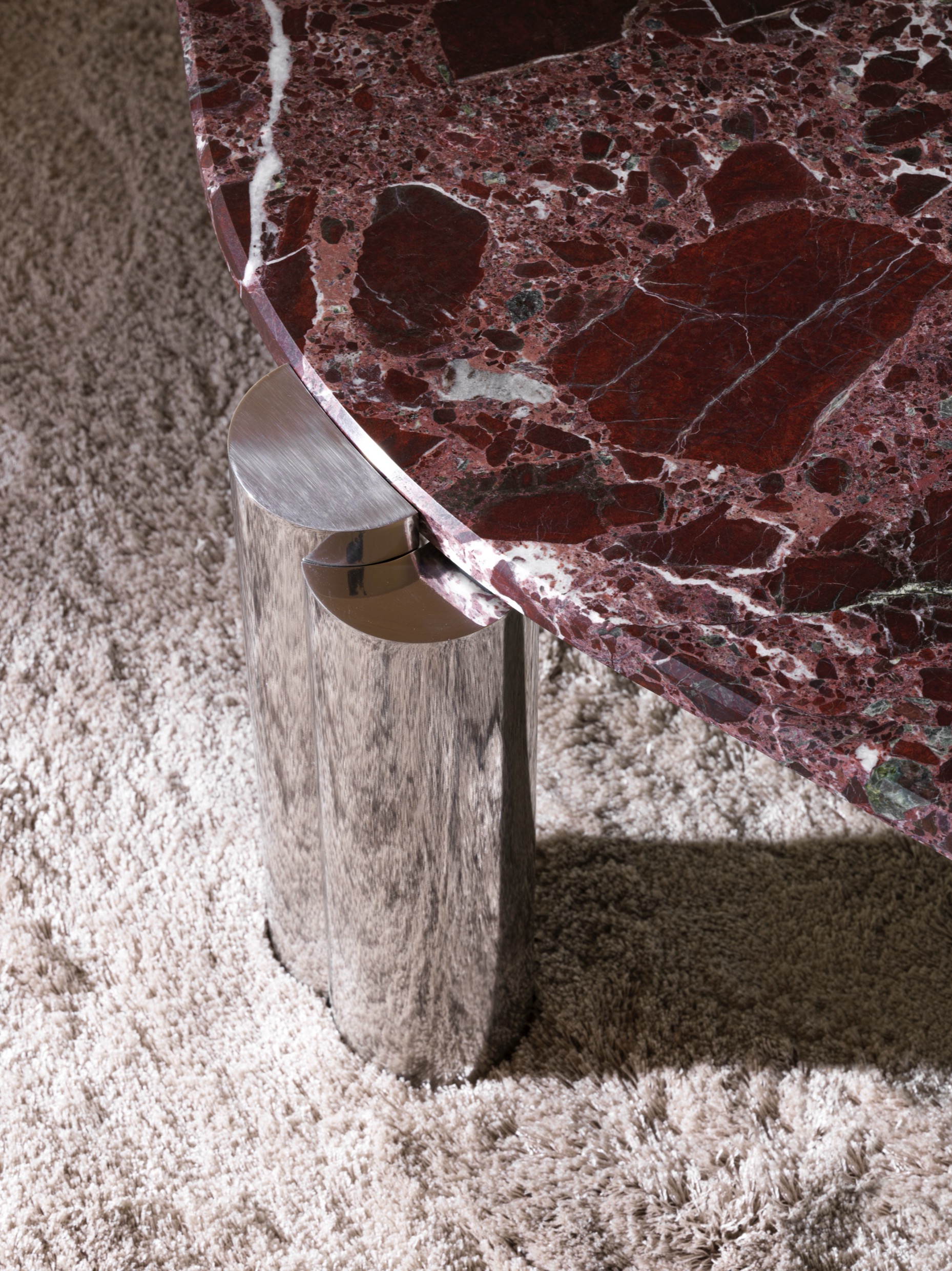 메이리스 (Maylis)는 기하학적 정밀함과 유기적 풍부함이 균형을 이루는 조형적 커피 테이블입니다. 크리스토프 델쿠르트(Christophe Delcourt)의 디자인으로, 육각형의 다면 형태 상판은 대리석, 강화 유리, 하이글로시 래커 마감 중 선택할 수 있으며, 각각 독창적인 미감을 자아냅니다. 대담하면서도 유연한 이 디자인은 델쿠르트의 다른 컬렉션과 자연스럽게 어우러지며, 현대적인 인테리어에 역동성과 유연함을 불어넣습니다. 다양한 소재의 조합은 메이리스의 핵심을 이루며, 매끄럽고 광택 있는 상판과 대비를 이루는 건축적인 베이스는 서로 다른 높이에 배치된 세 쌍의 반달 모양 알루미늄 다리로 구성되어 있습니다. 이러한 역동적인 구조는 보는 각도에 따라 빛과 그림자가 디자인의 깊이를 더욱 극적으로 드러내며, 끊임없이 변화하는 시각적 효과를 연출합니다.