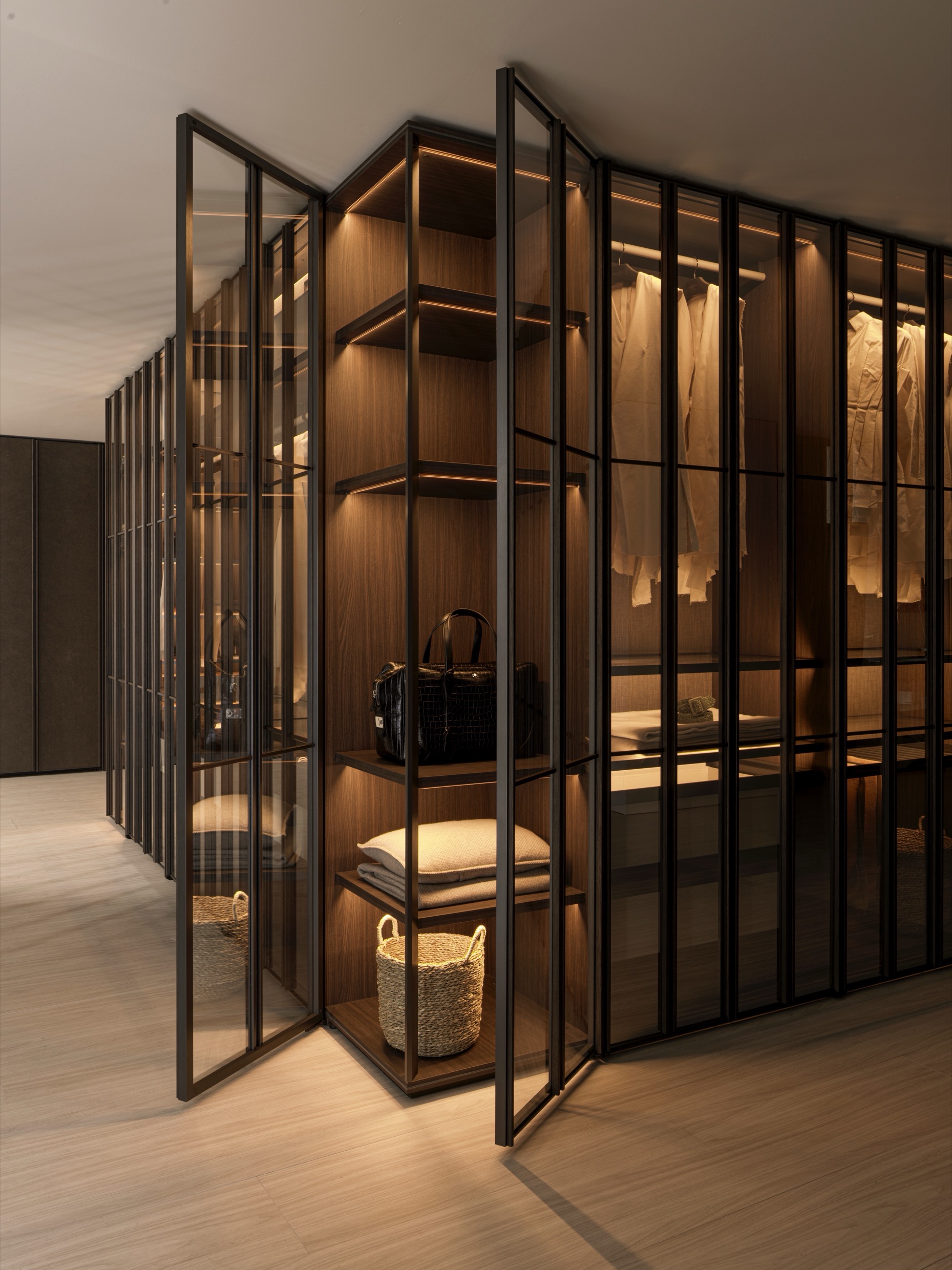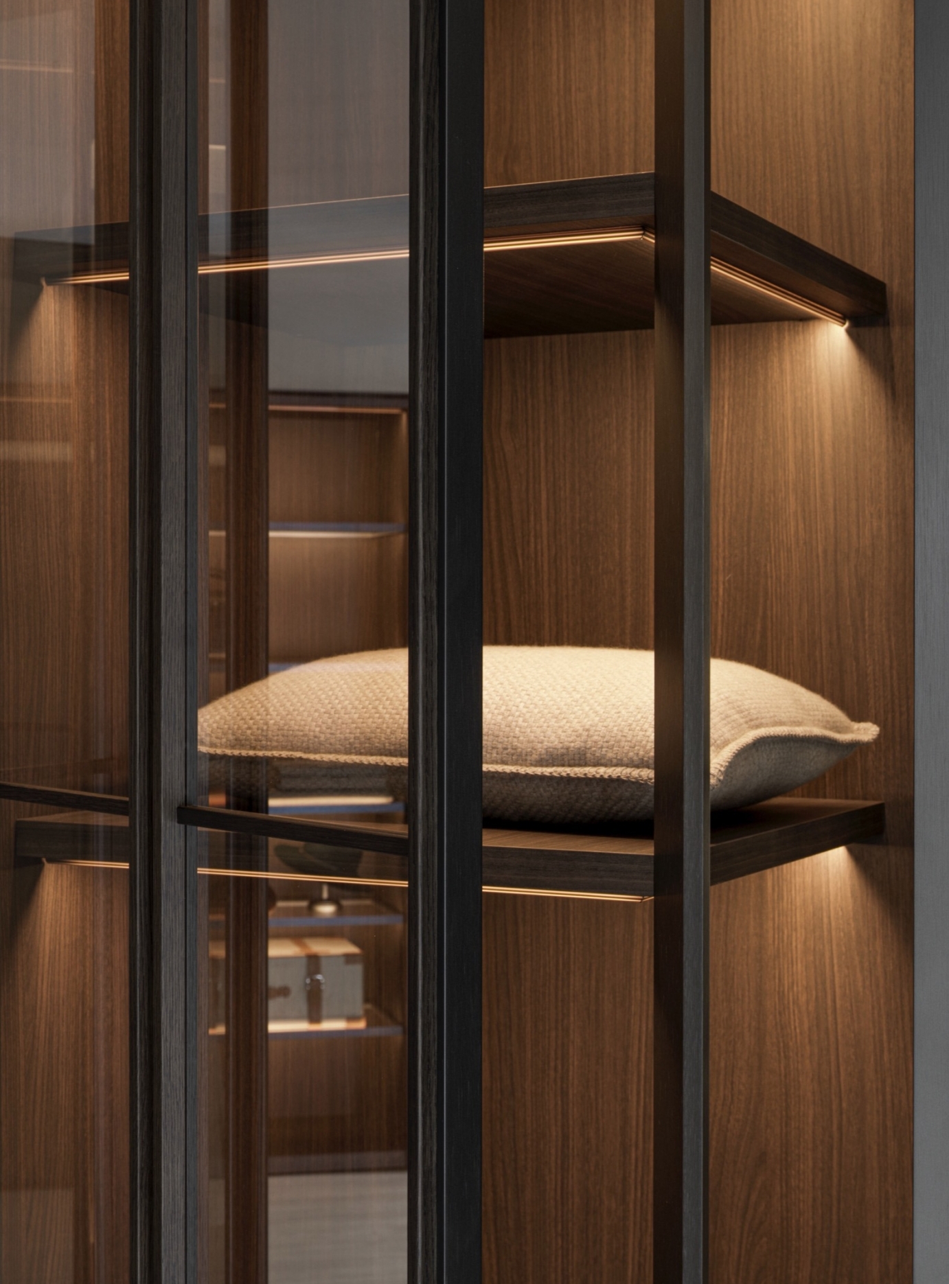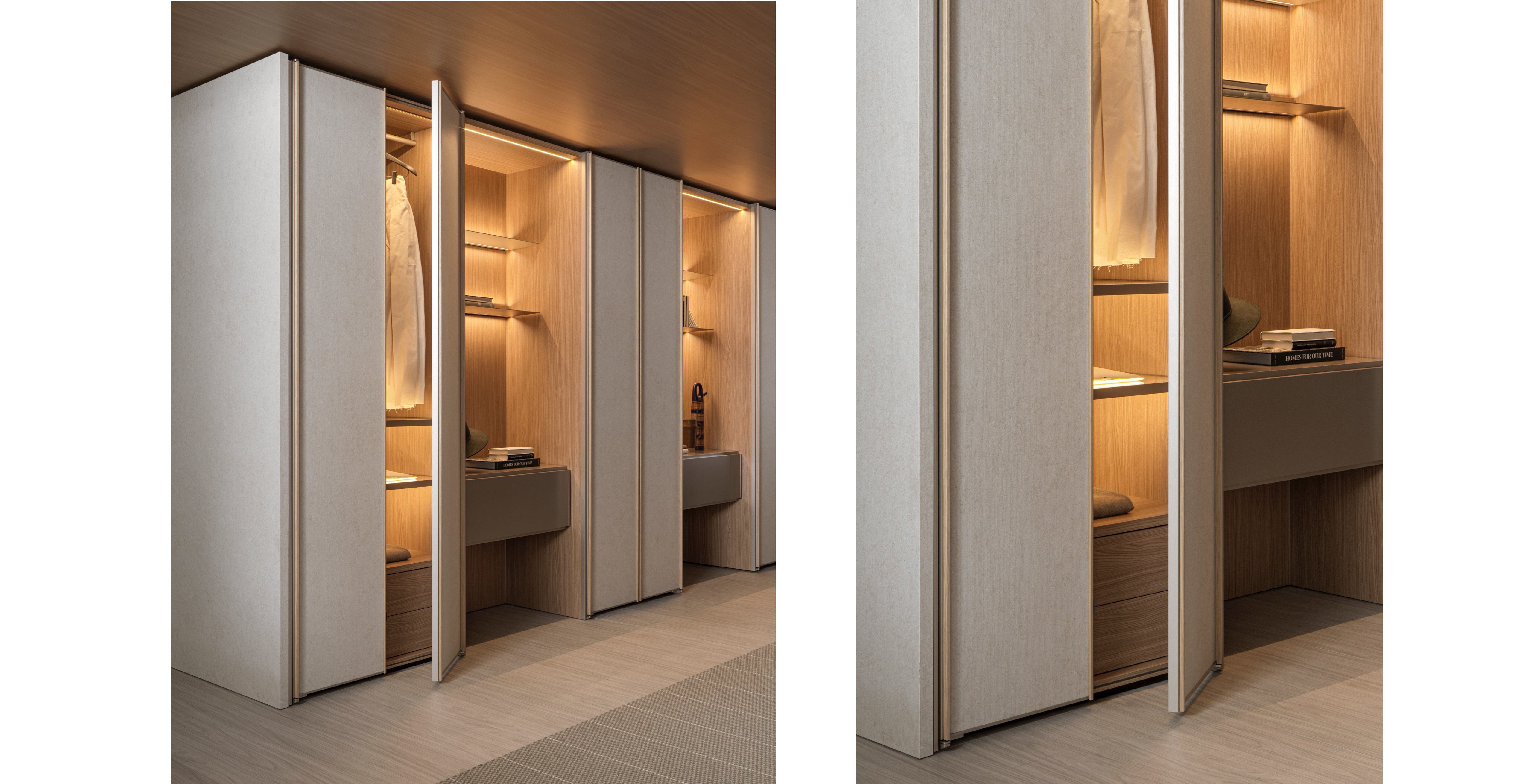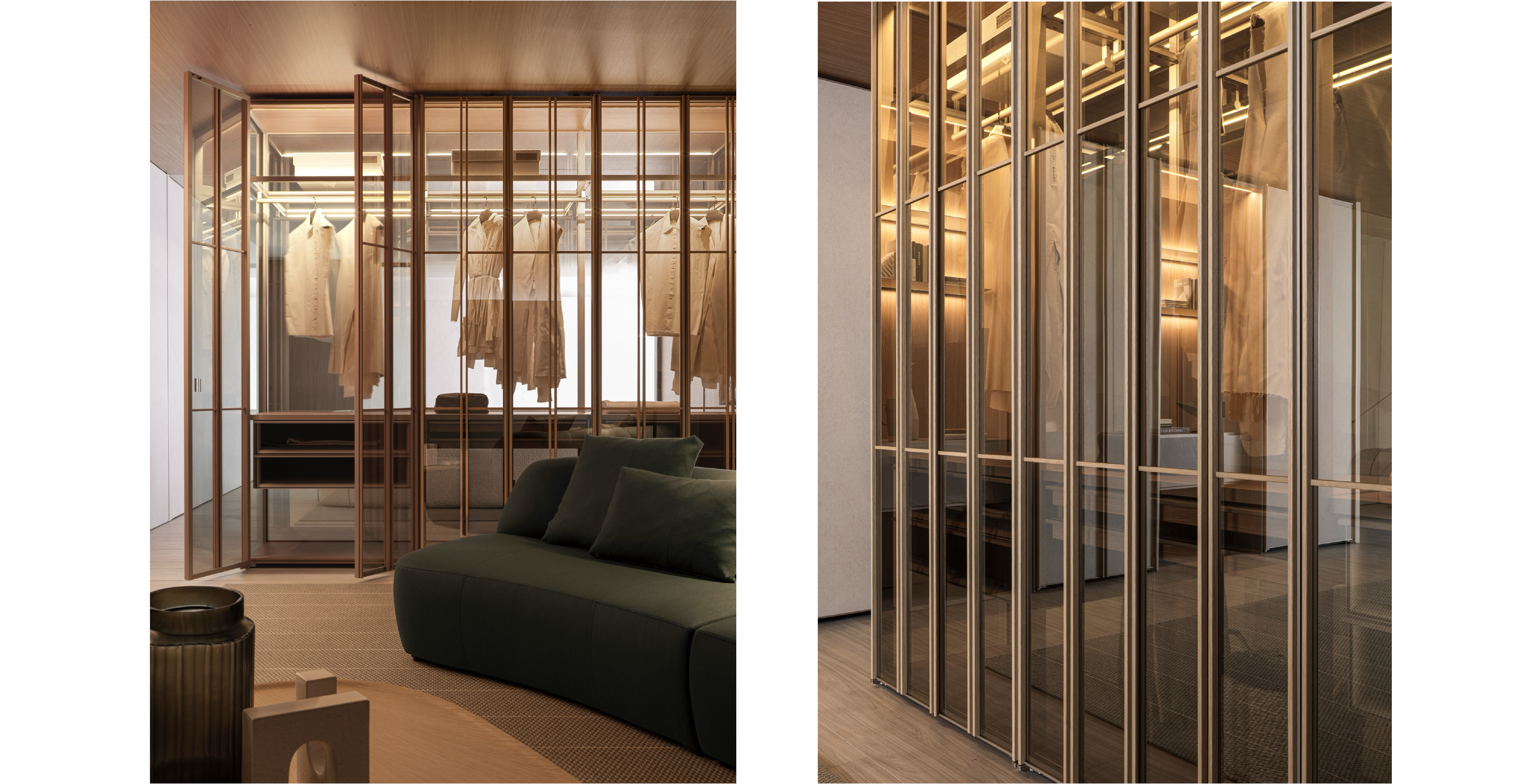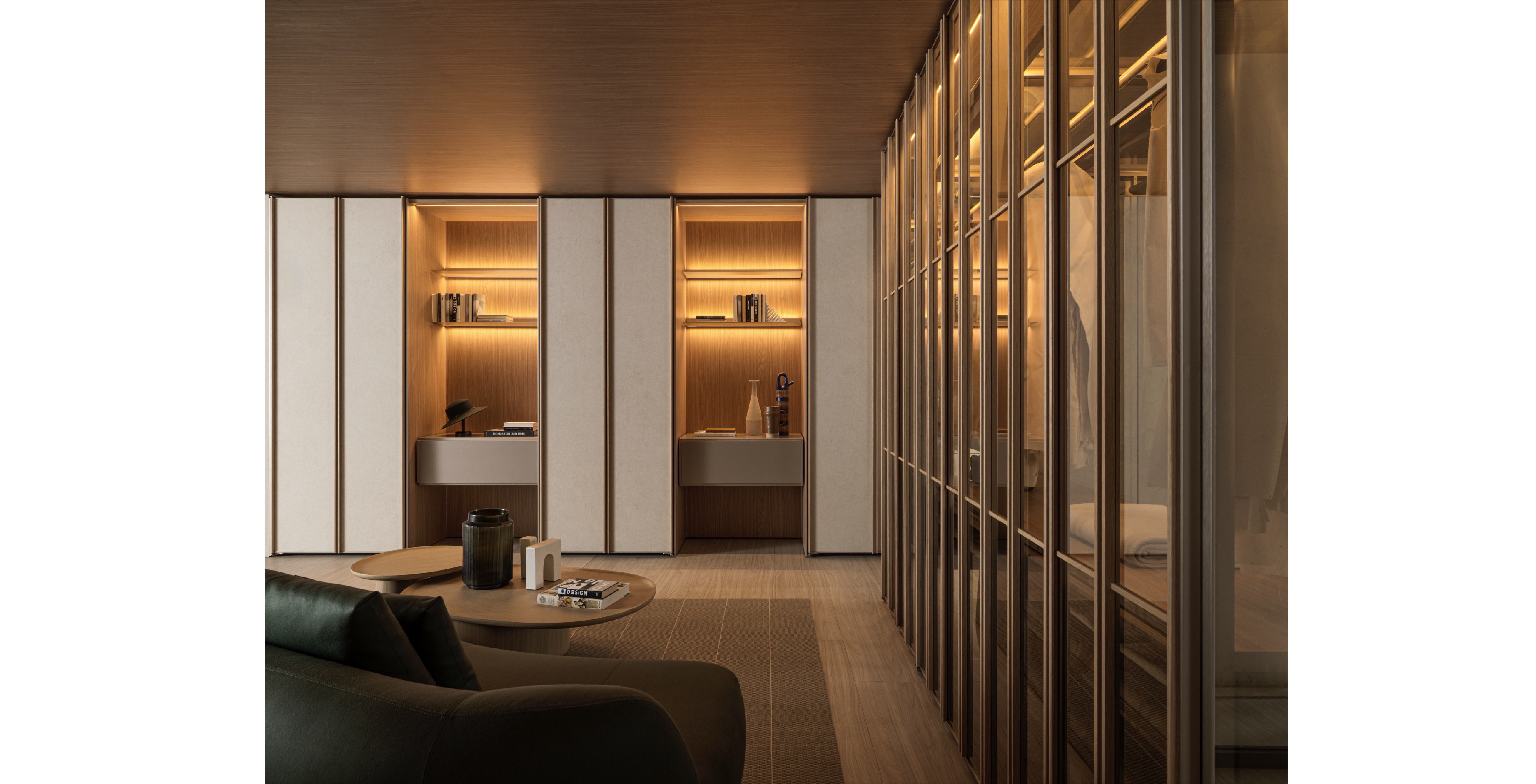 스튜디오 클라스 (Studio Klass)는 메리디안 (Meridian)을 통해 유리 옷장 도어에 대한 혁신적인 접근 방식을 제안하며, 빈센트 반 듀이센 (Vincent Van Duysen)의 상징적인 글리스 마스터 옷장 시스템에 장인 정신과 기술 혁신을 조화롭게 통합했습니다. 기존의 디자인에서 과감히 탈피한 메리디안은 옷장을 정교한 건축적 오브제이자 소재적 세련미를 담은 상징적인 요소로 승화시켰으며, 장식적인 분할 구조를 갖춘 최초의 유리 도어입니다. 이 혁신의 중심에는 Molteni&C의 미적‧기능적 완성도를 향한 끊임없는 탐구 정신을 반영한 특허 개폐 시스템이 자리하고 있습니다. 기존 유리 도어와는 달리 메리디안은 그 자체로 조각적 존재감을 지닌 요소로, 수평 분할과 수직 구조가 빛, 질감, 소재 간의 역동적인 상호작용을 만들어냅니다. 메리디안은 두 가지 구성으로 제공되며, 차세대 유리 및 이날코 (Inalco)의 MDI 세라믹을 활용해 지속 가능성과 정교한 장인정신을 동시에 구현합니다. 외부 소재는 우드 또는 메탈릭 마감 중 선택할 수 있으며, 수납 기능을 뛰어넘어 건축적 표현력을 갖춘 디자인 요소로 탈바꿈합니다. 프레임은 아이리스와 펠트 색상으로 제공되며, 손잡이는 선라이즈 오크, 커피 오크, 아이리스, 펠트로 등 다양한 옵션으로 구성되어, Molteni&C의 전체 인테리어 에코시스템과 조화를 이루는 마감 선택이 가능합니다.