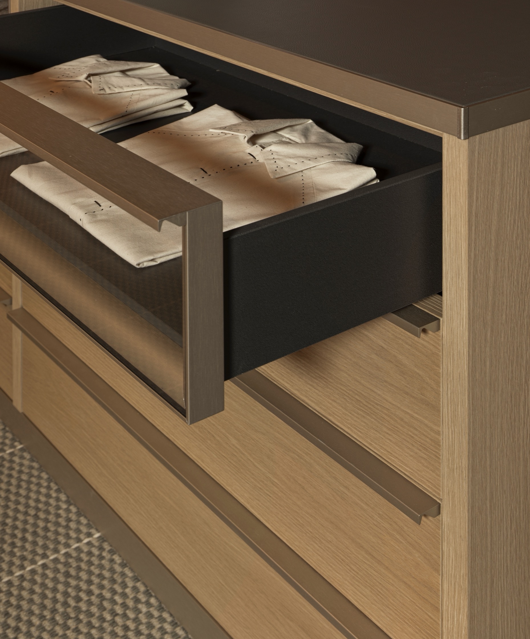 서랍 전면에 적용된 Hold 핸들은 사용 편의성을 높이는 동시에 아일랜드의 우아한 라인과 자연스럽게 어우러집니다. 3단, 4단, 5단 서랍 구성으로 제공되며, 다양한 높이 옵션을 통해 공간 제약 없이 유연하게 설치할 수 있습니다. 글리스 마스터 모듈러 아일랜드는 양면에서 모두 사용 가능한 구조로 디자인되어 옷장의 중심에 위치한 실용적인 허브 역할을 합니다. 또한, 사이즈와 구성 모두 완전 맞춤형으로 제작 가능하며, 상판은 본체와 동일한 마감으로 선택할 수 있을 뿐 아니라, 에코스킨 소재의 대비 마감을 활용해 시각적 포인트를 더할 수도 있습니다. 빈센트 반 두이센 (Vincent Van Duysen)의 시그니처 옷장 솔루션에 기능성과 우아함을 동시에 더하는 모듈형 아일랜드는, 체계적인 수납과 정돈된 라이프스타일을 완성하는 정교한 디자인 오브제로 자리잡습니다.